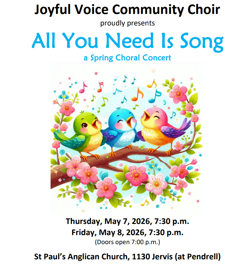 I will be directing the Joyful Voice Community Choir in two concerts on May 8th and 9th at 7:30pm, held at St. Paul’s Church (1130 Jervis St, Vancouver, BC).